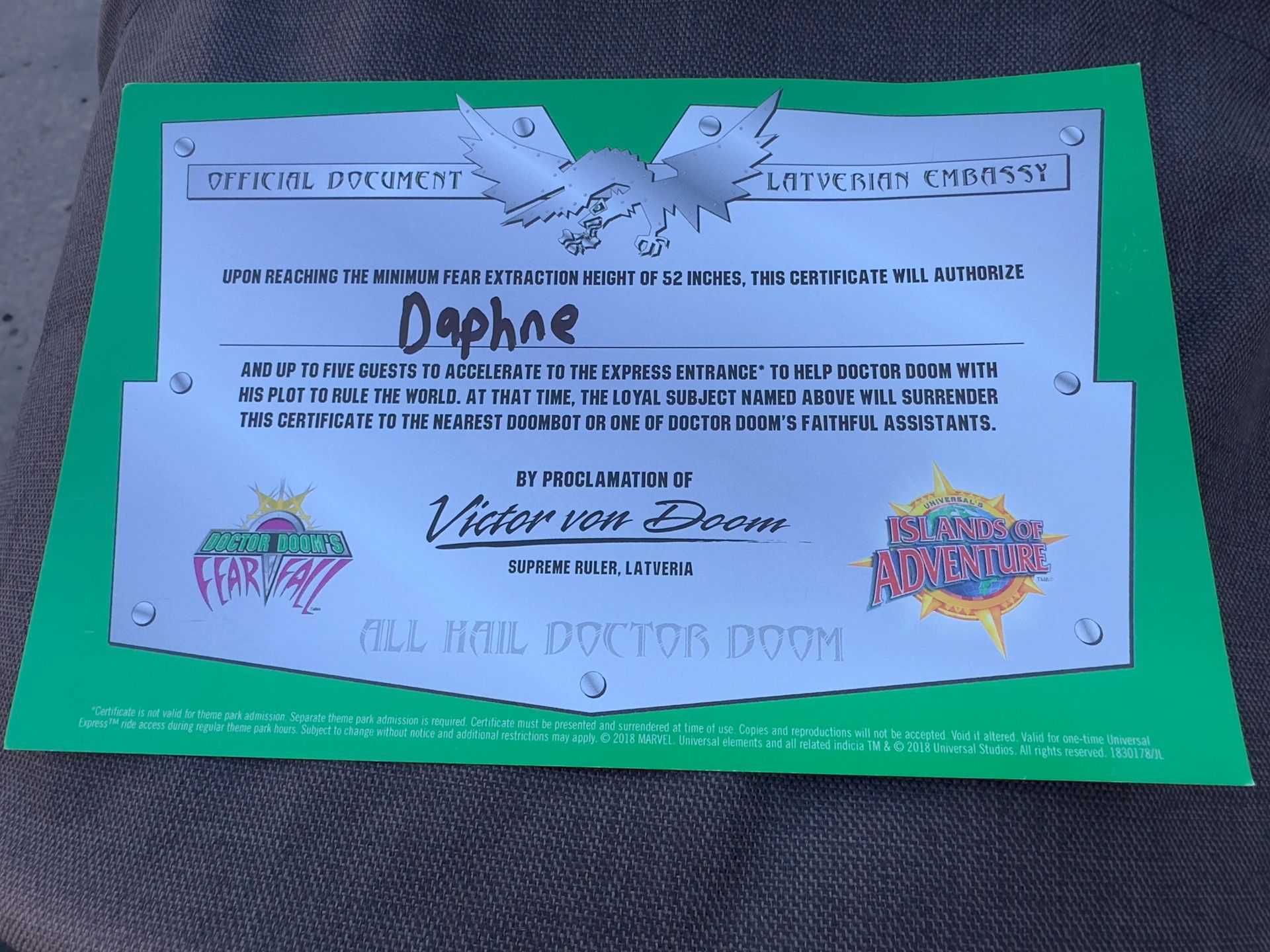 “Upon reaching the minimum Fear Extraction Height of 52 inches, this certificate will authorize Daphne and up to five guests to accelerate to the Express Entrance to help Doctor Doom with his plot to rule the world.”